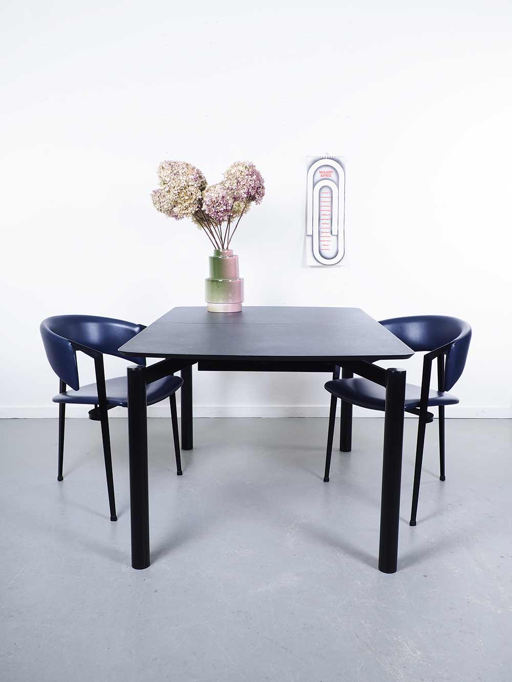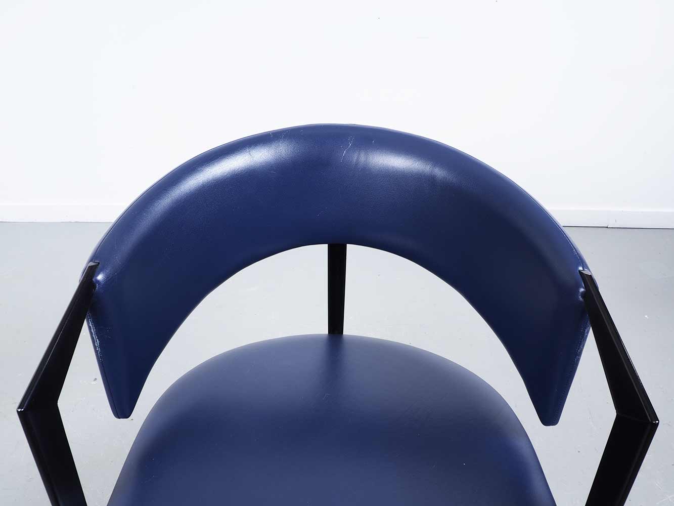 Castelijn stoelen. Set van twee postmoderne design stoelen uit de jaren 80 gemaakt door Castelijn (Nederland). Deze eetkamerstoelen hebben zwarte, dunne metalen poten, een paars/blauw lederen zitting en rugleuning. De modelnaam van deze Castelijn stoelen is SLA. de SLA heeft een elegant, strak en doorschijnend ontwerp. Bijzonder om te vermelden is dat deze eetkamerstoelen slechts drie poten hebben. Maar de constructie is zo goed, dat de stoelen net zo stevig zijn als iedere andere eetkamerstoel. Mooi postmodern Dutch Design. Je ziet duidelijk de handtekening van het Nederlandse bedrijf Castelijn. Castelijn was één van de bekende Nederlandse meubelbedrijven, die postmodern meubeldesign combineerde met vakmanschap en kwaliteit. Castelijn is nog steeds een gerenommeerd meubelbedrijf en wordt nog steeds door de familie Castelijn gerund.