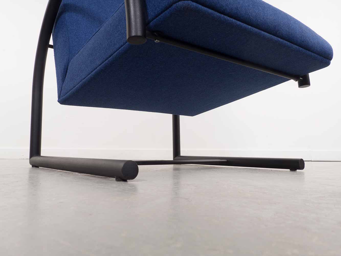 Nieuw gestoffeerde “Cirkel” fauteuil. Niet alleen een comfortabel maar ook een speels, postmodern ontwerp. Met mooie kleine details, zoals hoe de zitting en rugleuning lijken te zweven in het metalen frame. Deze fauteuil is opnieuw gestoffeerd met een blauwe stof. Een prachtige 80s stoel die past in elk postmodern of eclectisch interieur.