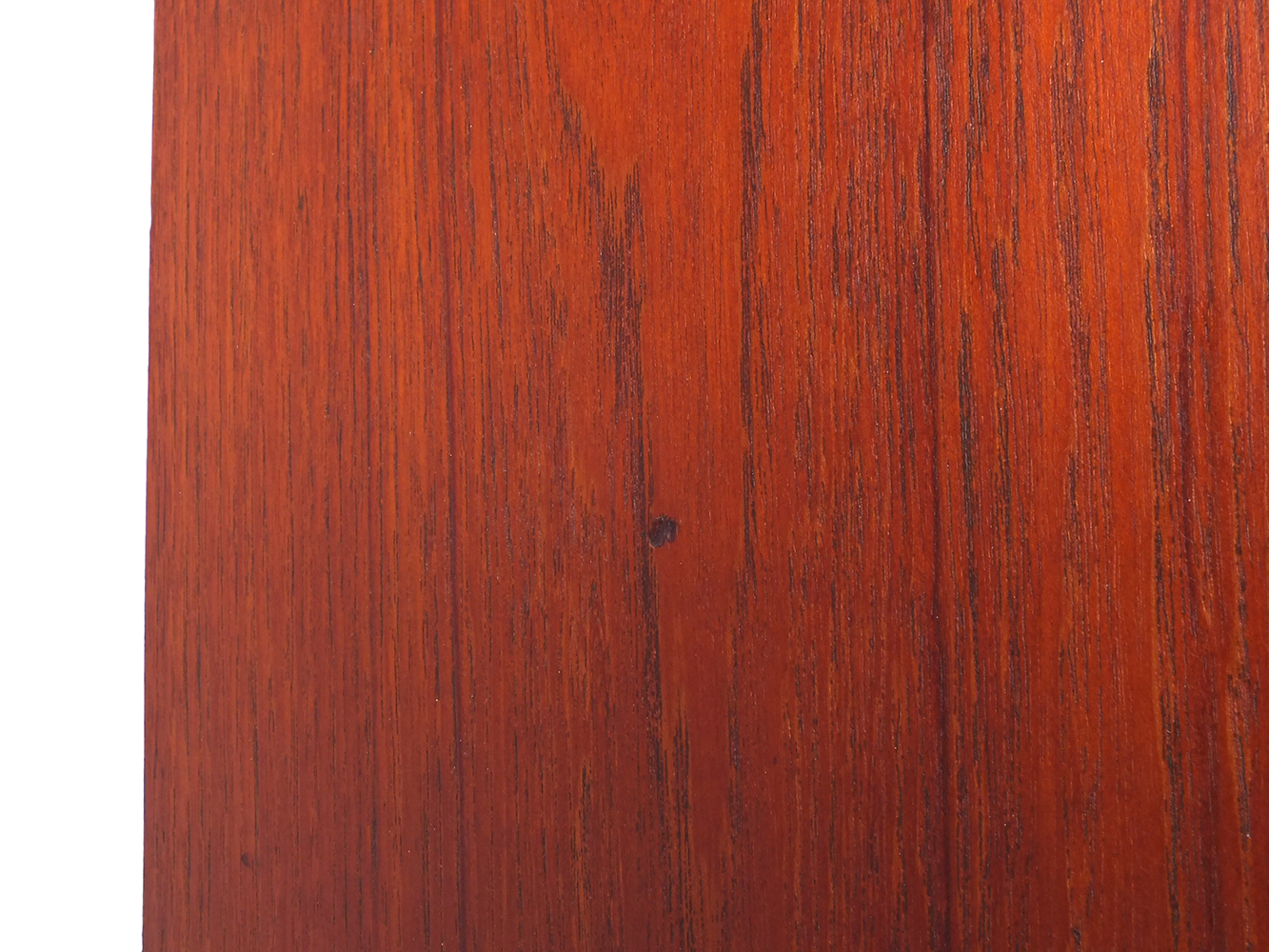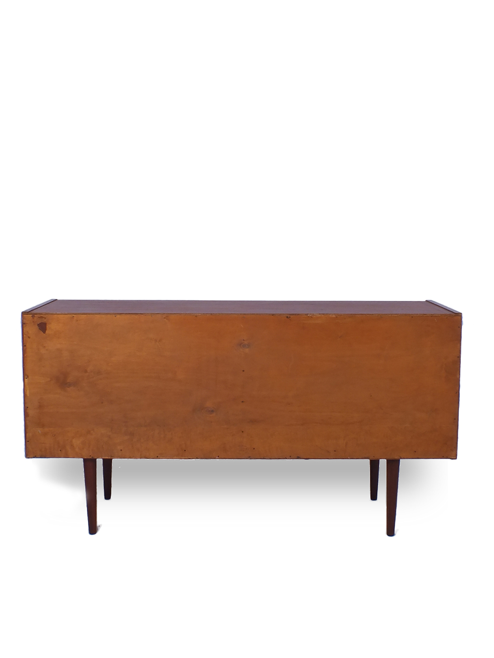 Bijzonder teak houten dressoir ontworpen door Johannes Andersen (Denemarken). Dit dressoir staat hoog op de taps toelopende poten, heeft een schuifdeur en vier laden met mooie strakke handgrepen.