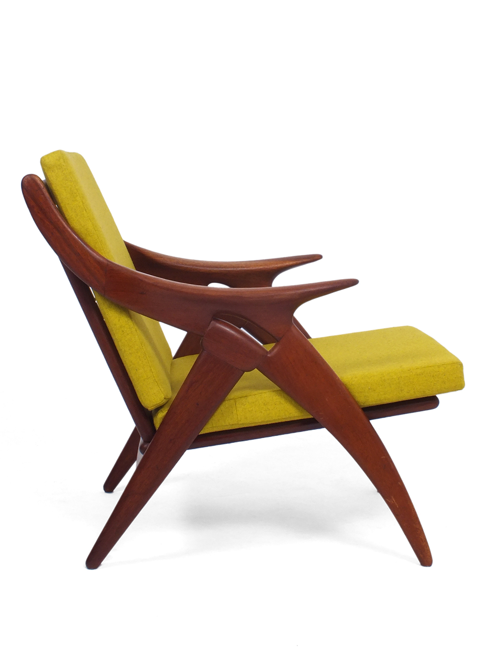 Teak houten fauteuil van De Ster Gelderland, met fraaie organische vormgeving en een kenmerkend detail “de knoop” waar de rugleuning overgaat in de poten. De kussens zijn vernieuwd en bekleed met een gele wollen vilten stof van Keymer.