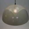 Mooie speelse wit metalen hanglamp van het merk Vicenza. Chique, Italiaans Design uit de jaren 70. De halfronde kap geeft veel licht op de tafel en het vierkante geperforeerde patroon geeft een beetje licht aan de bovenkant. Een strakke maar speelse, jaren 70 lamp die past in een licht interieur, maar ook bij de Mid Century Modern stijl.