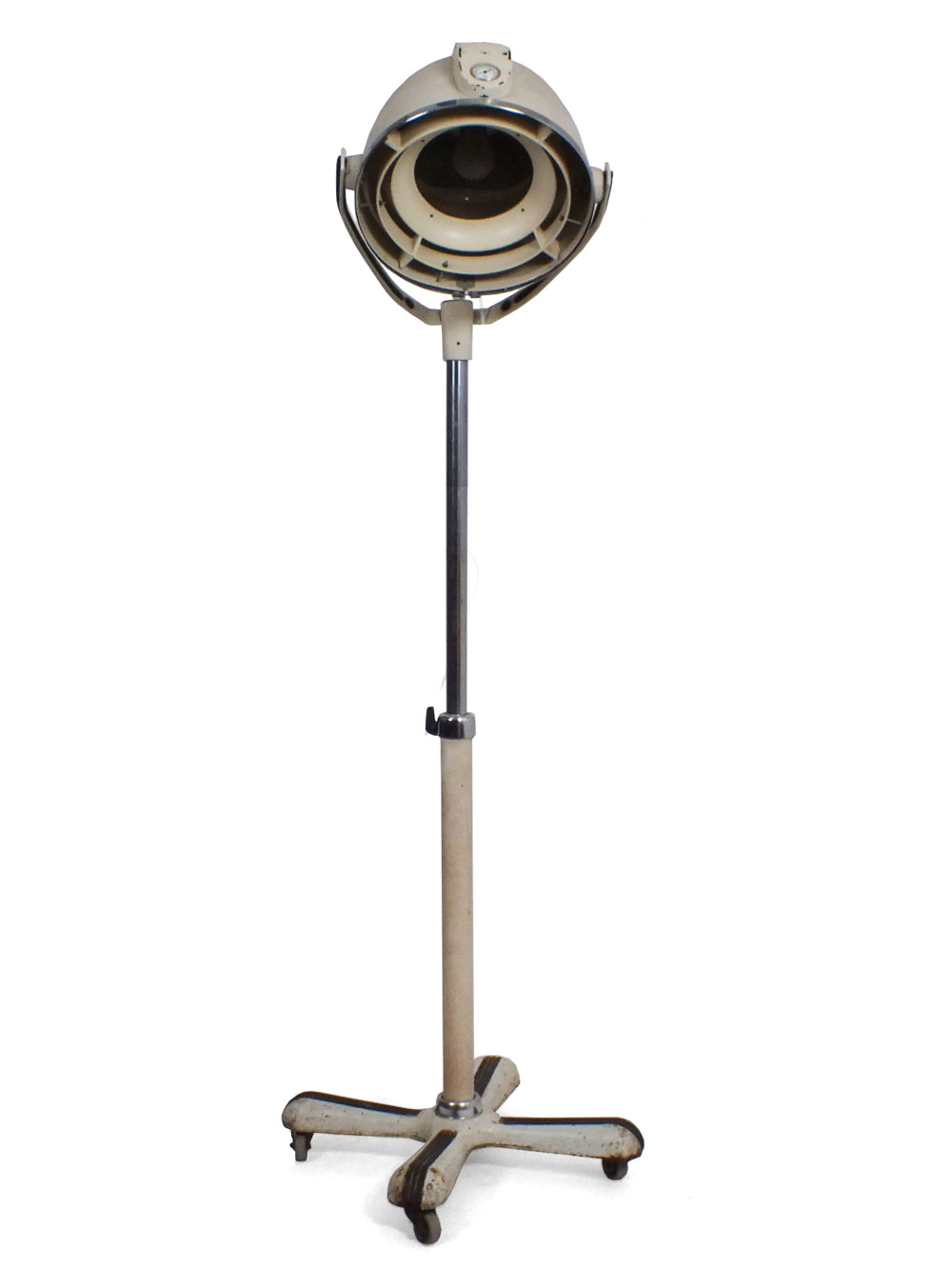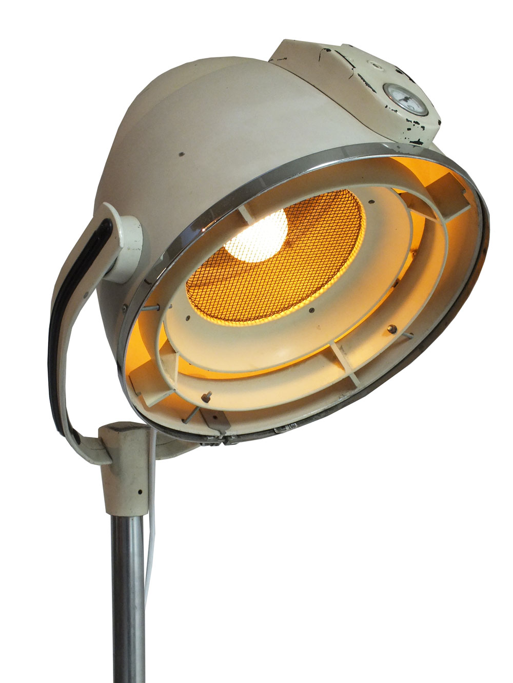 In hoogte verstelbare en verrijdbare lamp gemaakt van een oude droogkap. De lamp is bedraad met strijjkijzersnoer. Een blikvanger.