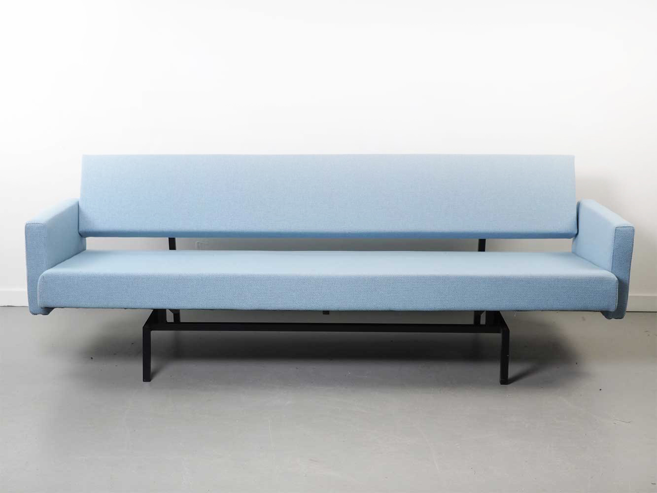 Een iconische 3-zits bank ontworpen door Martin Visser, en geproduceerd door ’t Spectrum in Nederland rond 1960. Deze slaapbank is gemaakt van zwart gelakt metaal en heeft nieuw hr schuim en is gestoffeerd met een structuurstof van Kvadrat – Maharam – Merit. Door de zitting van de bank omhoog te brengen en uit te trekken, ontstaat een bed.