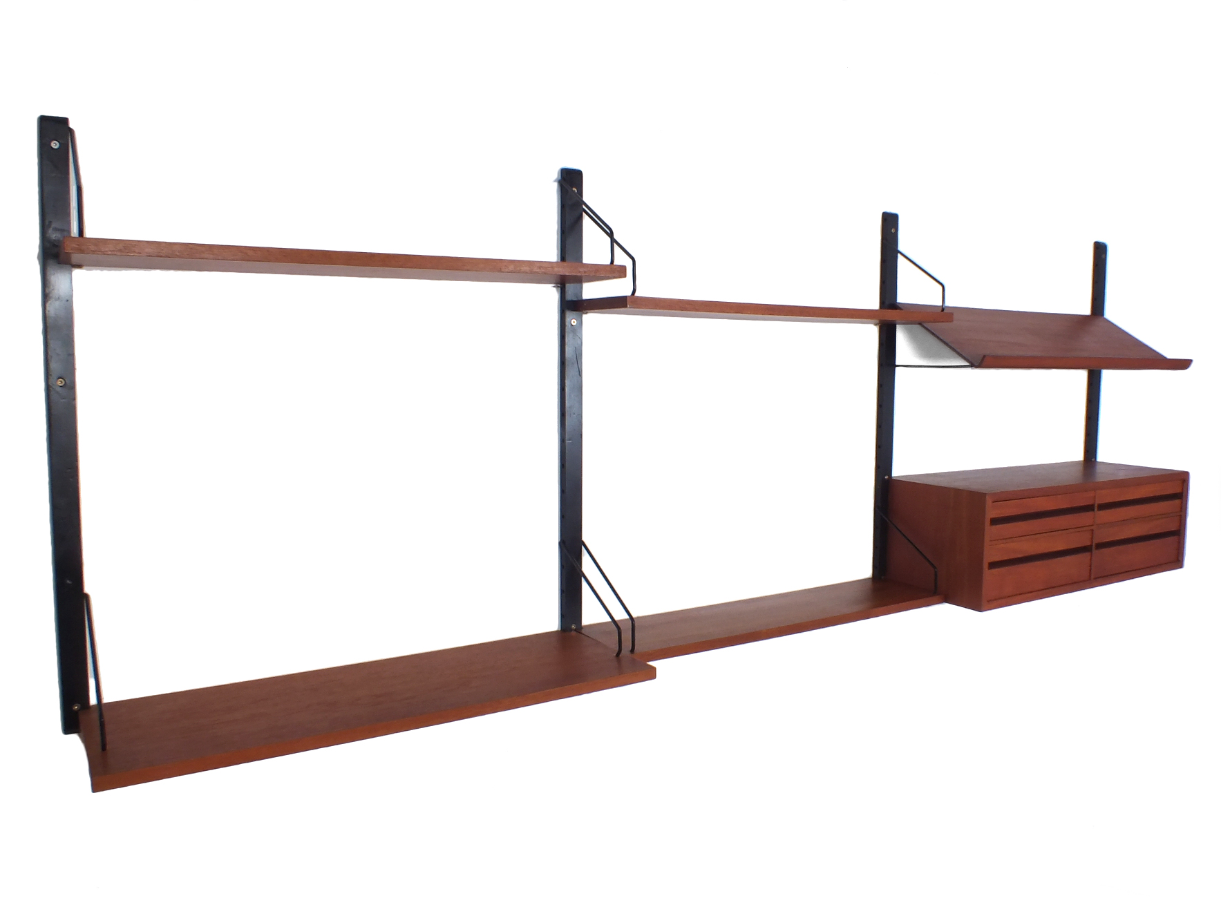 Deens Mid Century Modern wandsysteem – Royal System – ontworpen door Poul Cadovius in 1948. Dit systeem is modulair, zodat je de planken en andere onderdelen op iedere gewenste plek in het wandsysteem kunt hangen. Dit specifieke wandsysteem heeft een kastje met laden waarvan de bovenste lade aan de binnenkant bekleed is met groen vilt. Dit kastje heeft ‘afgeronde hoeken’. Dan is er een tijdschriftenhouder van gebogen teakhout. En er zijn drie normaal formaat planken en één grote plank.