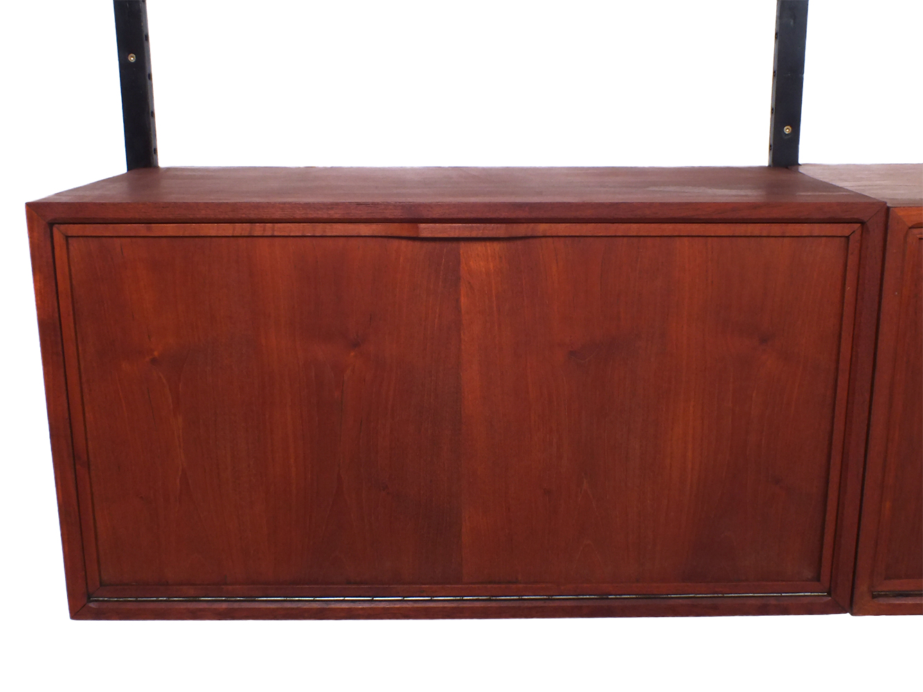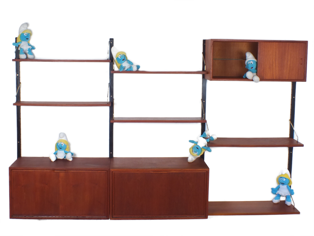 Deense Mid-Century Modern wall system genaamd Royal System – ontworpen door de Deen Poul Cadovius. Dit systeem is modulair; je kunt de plaats van kastjes en de planken zelf bepalen. Mid-Century Danish Design.