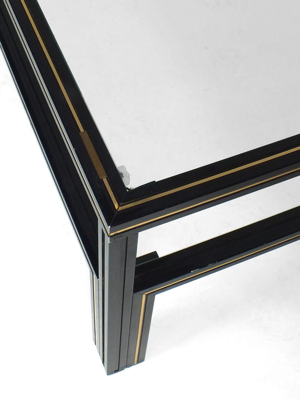 Deze salontafel is ontworpen door Pierre Vandel in Parijs, Frankrijk, in de jaren ’70. De tafel is gemaakt van zwart gelakte aluminium metalen frames en heeft gouden randen en twee glazen tafelbladen. De tabel is gemerkt door de fabrikant (zie afbeelding). De bovenste glasplaat heeft een geslepen facetrand.