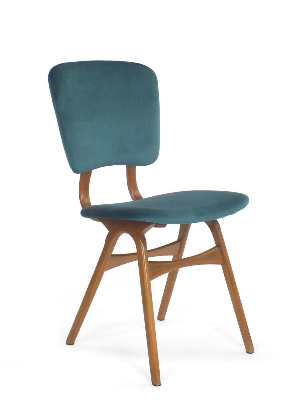 Bijzondere set Nederlandse jaren 50 eetkamerstoeltjes met fraaie poten. De stoeltjes hebben nieuw schuim en zijn professioneel gestoffeerd met een groen blauwe fluwelen meubelstof. Past in een speels mid century modern interieur en bij iedere eettafel.