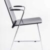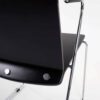 Set van vier strakke, Italiaanse, 80s eetkamerstoelen. De zitting van deze stoelen bestaat uit twee vernuftig aan elkaar vastgemaakt zwarte stukken plywood en – uit één stuk – een dunne chromen buis als onderstel. De armleuningen, waar het buissysteem begint en eindigt, hebben een verdikking van zwart kunststof. Een elegant, transparant en speels ontwerp met mooie details zoals de puntjes van de armleuningen en de chromen knoppen waarmee de zitting aan de rugleuning is gemonteerd.