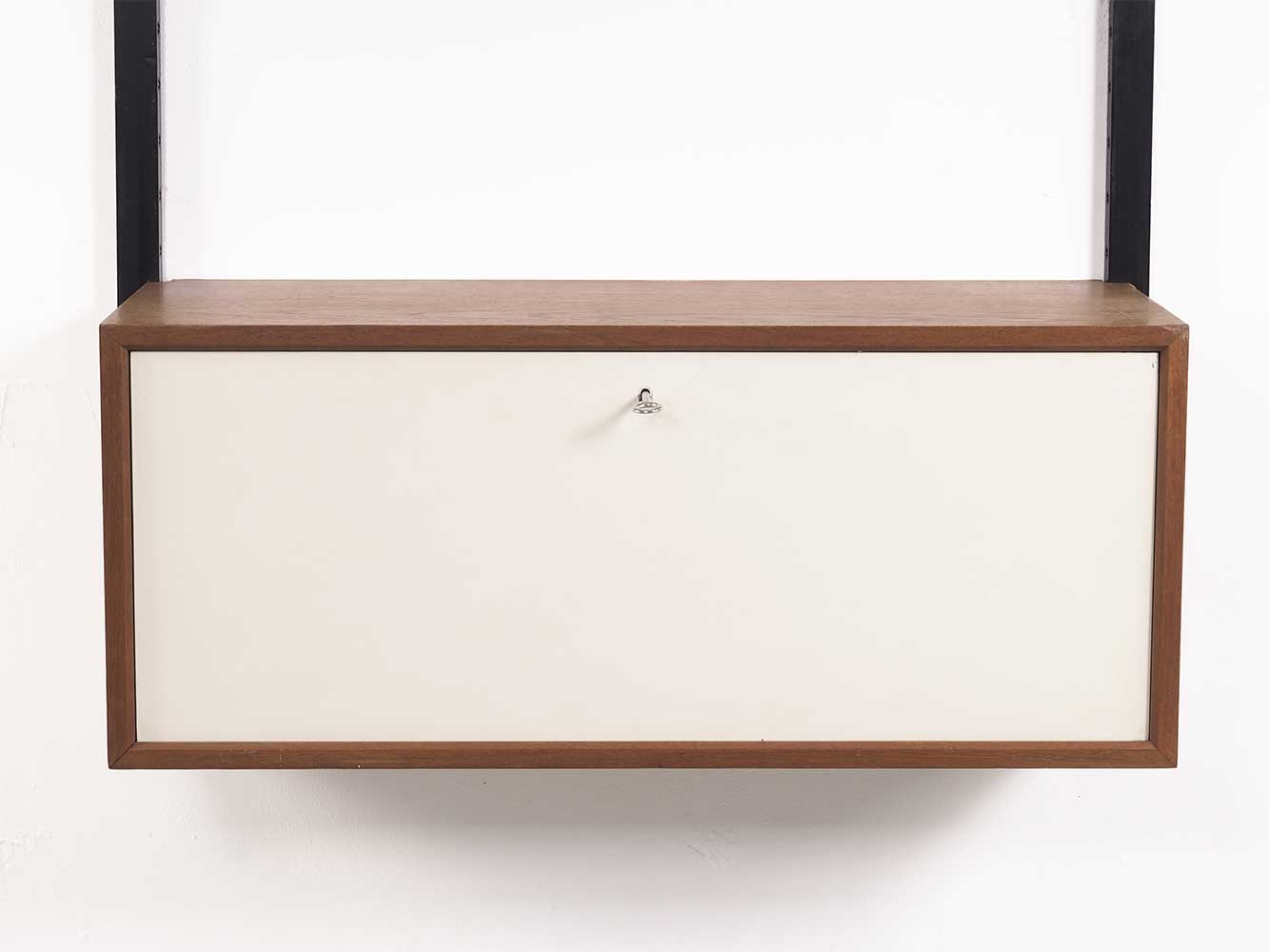 Royal System wandsysteem met wit klapkastje, ontworpen door Poul Cadovius eind jaren 40 en geproduceerd door zijn fabriek Cado. Het Royal System is modulair; je kunt planken en kast hangen tussen de muurlaten op verschillende hoogtes. Én dit wandsysteem kun je uitbreiden met steeds een nieuw deel. Het witte kastje in deze set zie je niet vaak. De binnenkant van dit klepkastje heeft twee vakken. Handig om wat op te bergen.