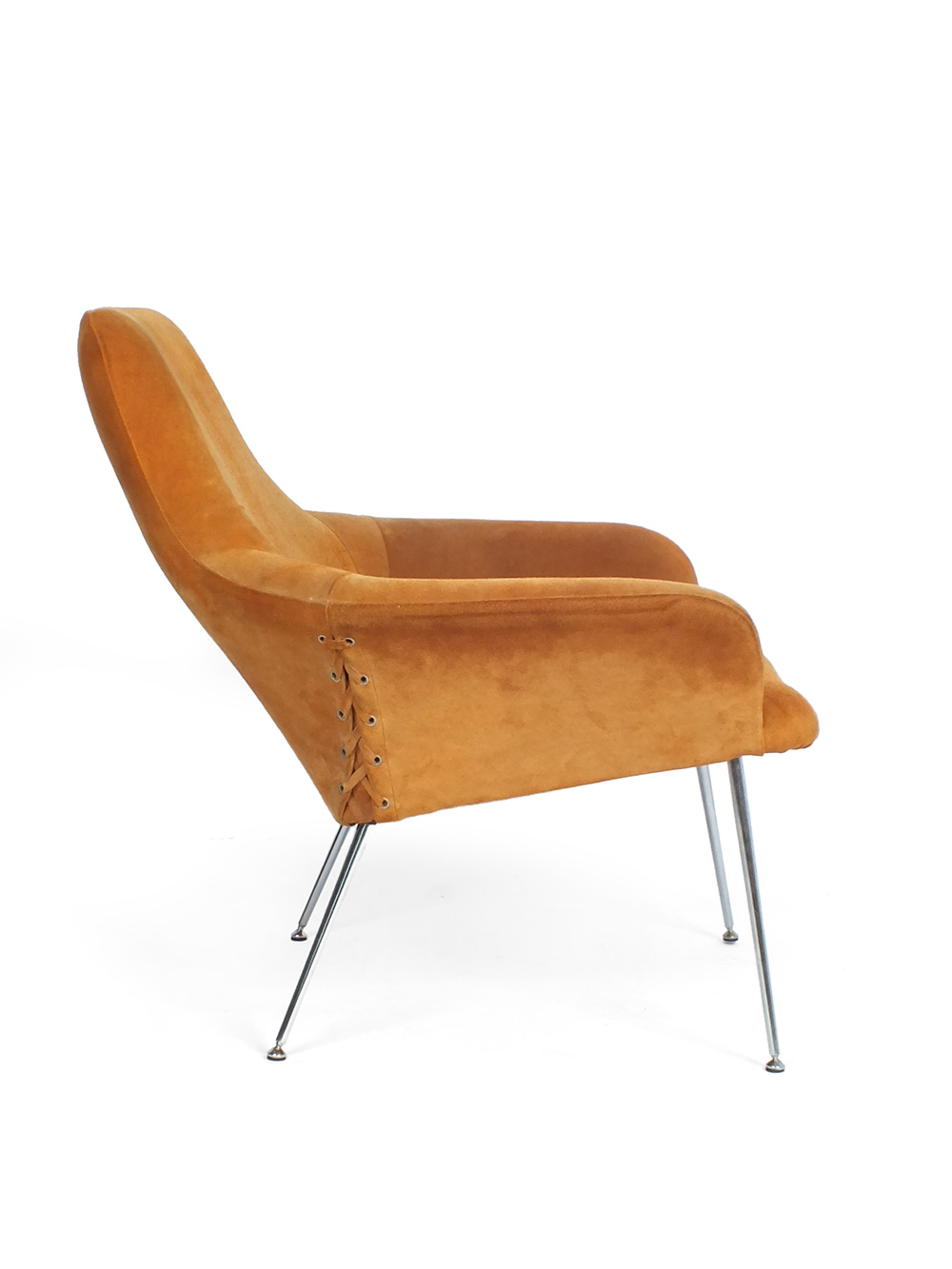 Suede lounge chairs with slightly tilted metal legs and tan colored suede upholstery. Look at the details on the back: the suede is tied with a lace.