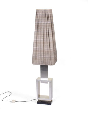 This floorlamp has an open metal base and a hood covered with transparent fabric.