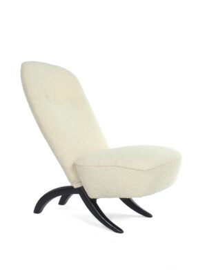 The Congo is a fine example of playful design from the 50s. This chair was designed by Theo Ruth in 1952 for Artifort. Ruth was inspired by African chairs. This chair consists of two parts that keep each other in perfect and firm balance. The seat offers a lot of comfort due to the sturdy suspension that Artifort incorporated into the chairs at that time. This chair has black lacquered organically shaped legs and isprofessionally re-upholstered with a luxurious bouclé fabric (a rich blend of wool and cotton). A true eye catcher!