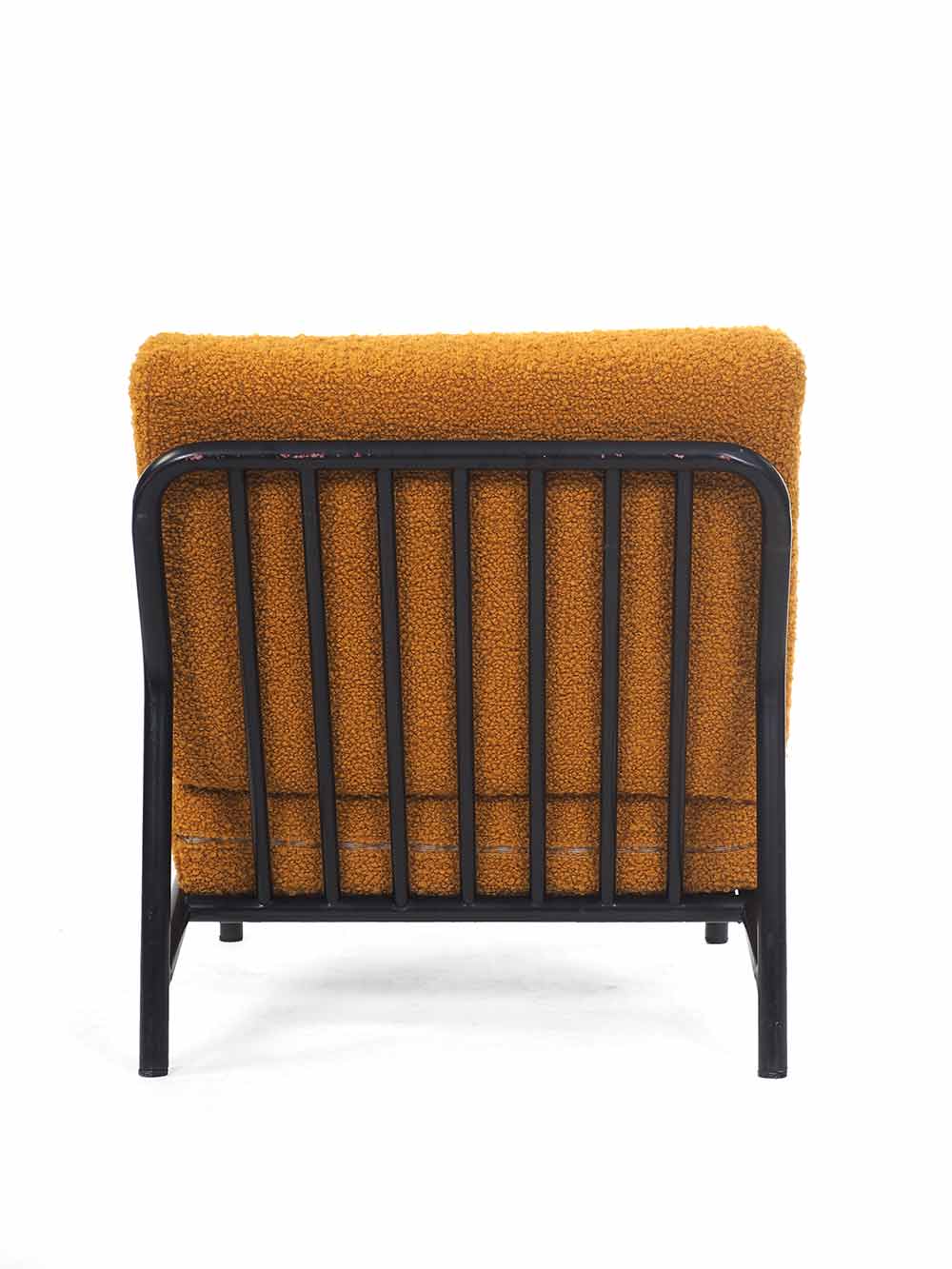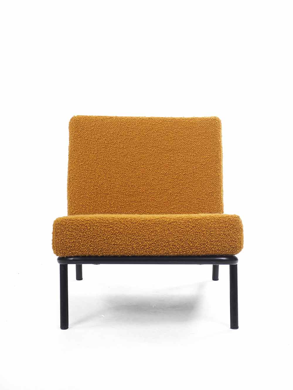 Two lounge chairs designed by Alf Svensson (Sweden) in the early 50s. These metal versions where made by Dux (Sweden) for Artifort (the Netherlands). The cushions are new and filled with hr quality foam for comfort and upholstered with off white and ocher colored boucle. A simple, very comfortable and elegant mid century modern design. Svensson was way ahead of his time!