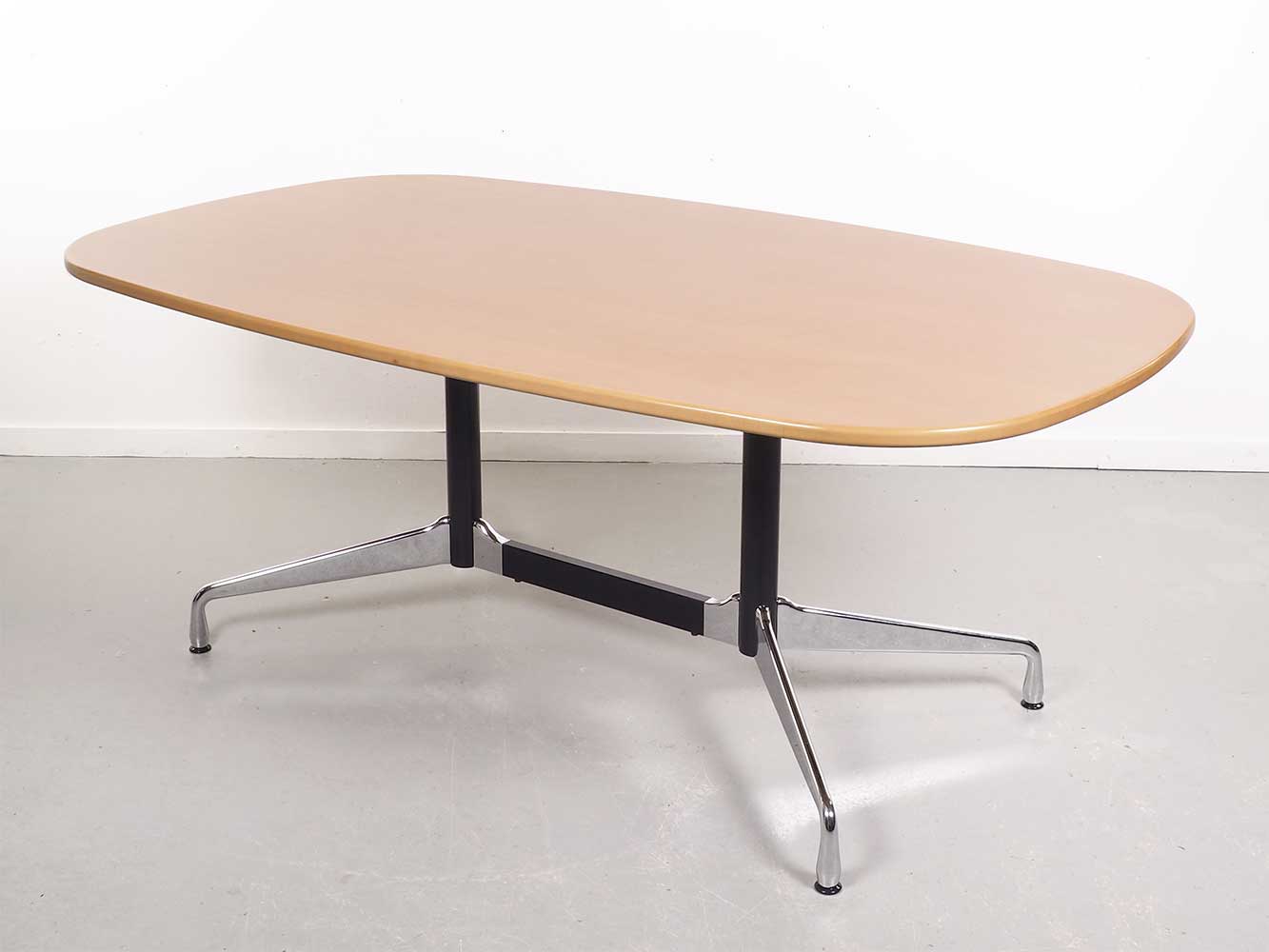 Large Eames segmented table, designed by Charles and Ray Eames in the 60s and produced by Vitra. The well-known base of this table has chrome legs and the table has a wooden top. The barrel-shaped table top, the chromed legs, the black columns and the wooden edge are beautiful details. The legs of this table are adjustable, so suitable for all types of surfaces. Because the table legs are in the middle of the top, they do not bother, when sitting at the table. This table offers ample space for eight people, but it is also comfortable for ten people. If you want to use this table as a desk, you have plenty of space. The segmented Eames table is a design classic. The table is marked.