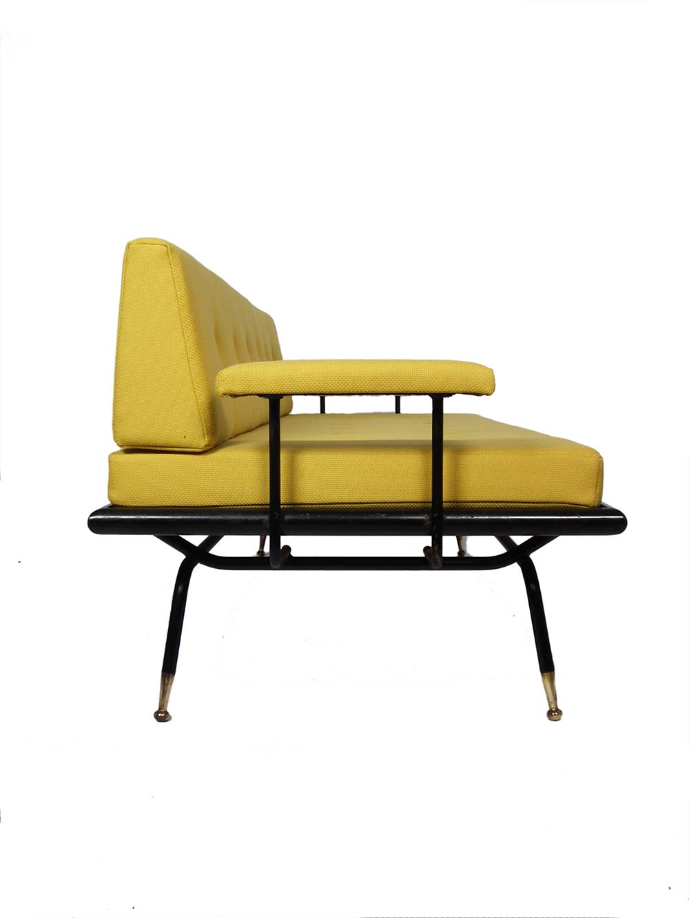 Rare sofa bed, completely renovated, re-upholstered and padded. Without a back cushion, this three-seater sofa can be used as a sofa bed or daybed. The elegant design has a black metal base with slanted, slightly tapered legs and brass socks / feet. A sleek but playfully designed sofa bed.