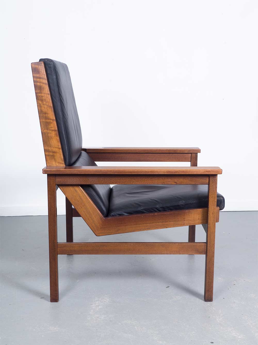 Teak wooden lounge chair, model Lotus. Designed by Rob Parry for Gelderland. Black leather cushion. Springs have been replaced.