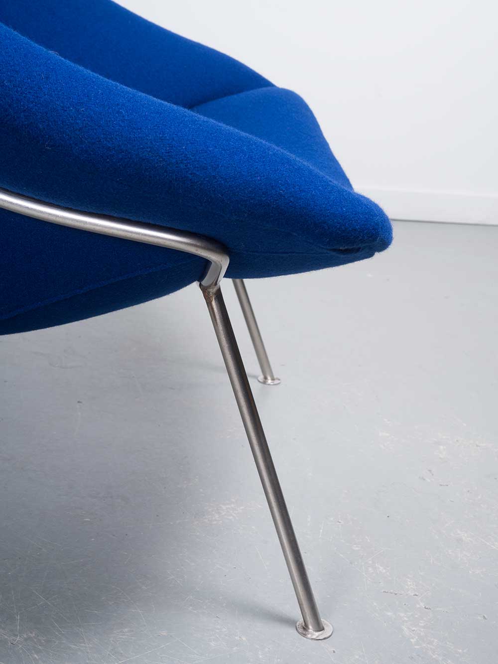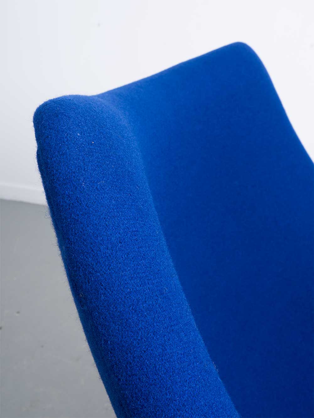 Oyster F157 designed by Pierre Paulin in 1958 for Artifort (Netherlands). This chair is a true Dutch Design classic. The metal legs are slightly angled, and the bent plywood shell seems to float above these legs. A soft layer of molded foam has been professionally reupholstered with a beautiful, bright blue wool fabric from Kvadrat’s Tonus 4 series.
