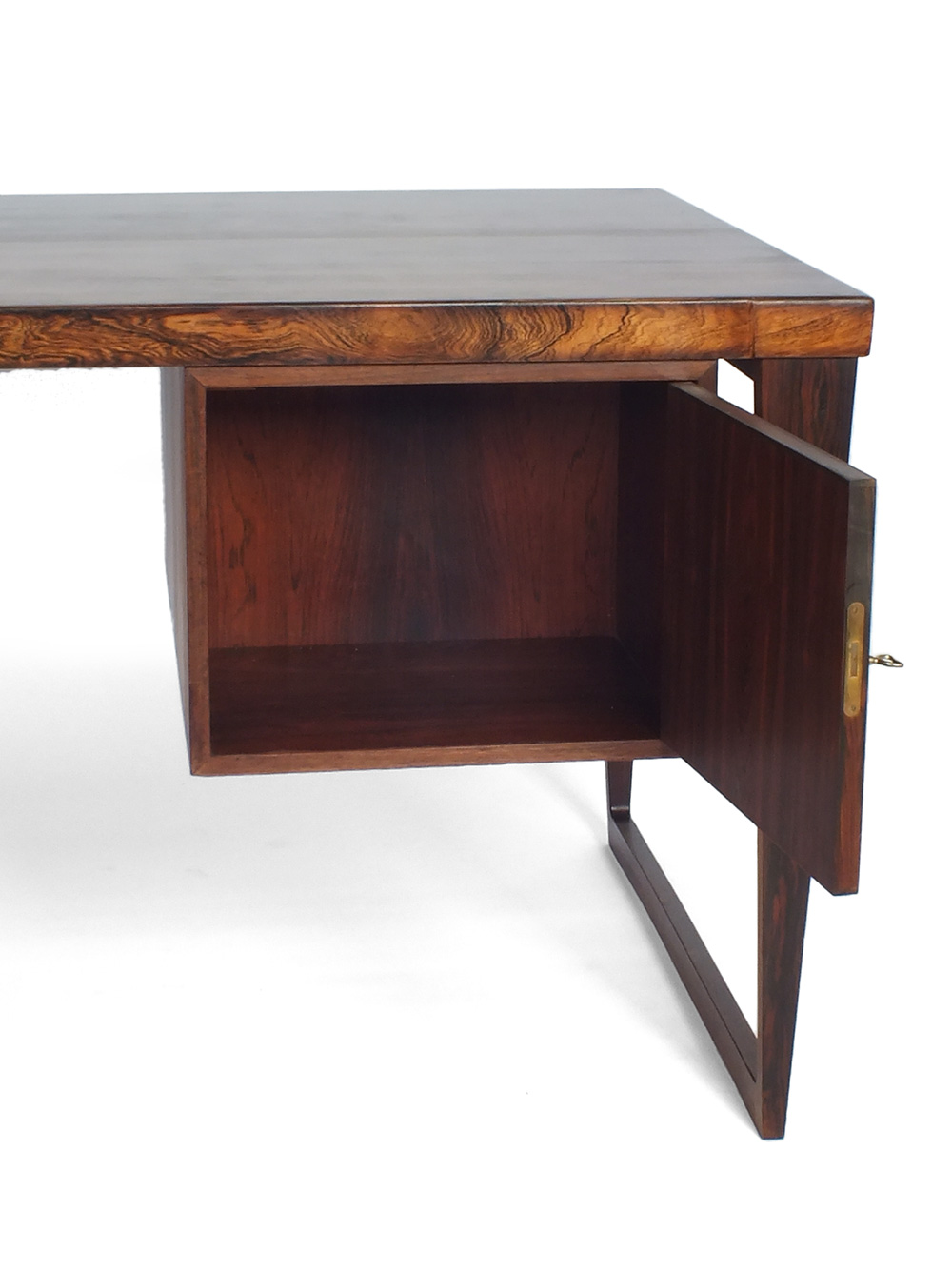 This free-standing desk designed by Kai Kristiansen – model 70 – is made of Brazilian rosewood, has on the frontside two sets of drawers and on the rearside two cabinets. The runner-shaped legs are solid Brazilian rosewood. There are two keys included which fit all locks.