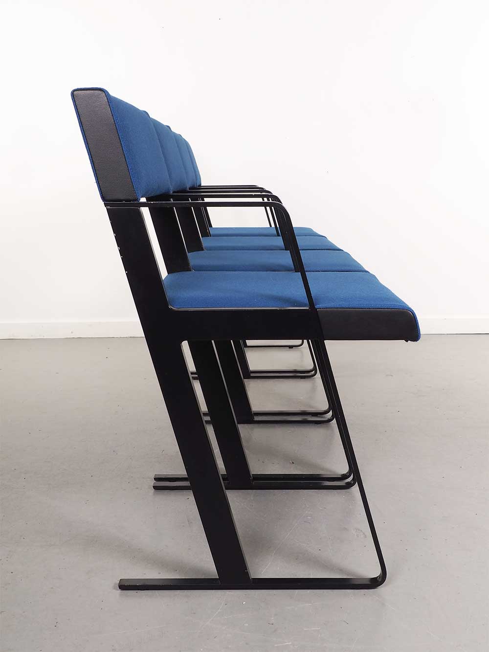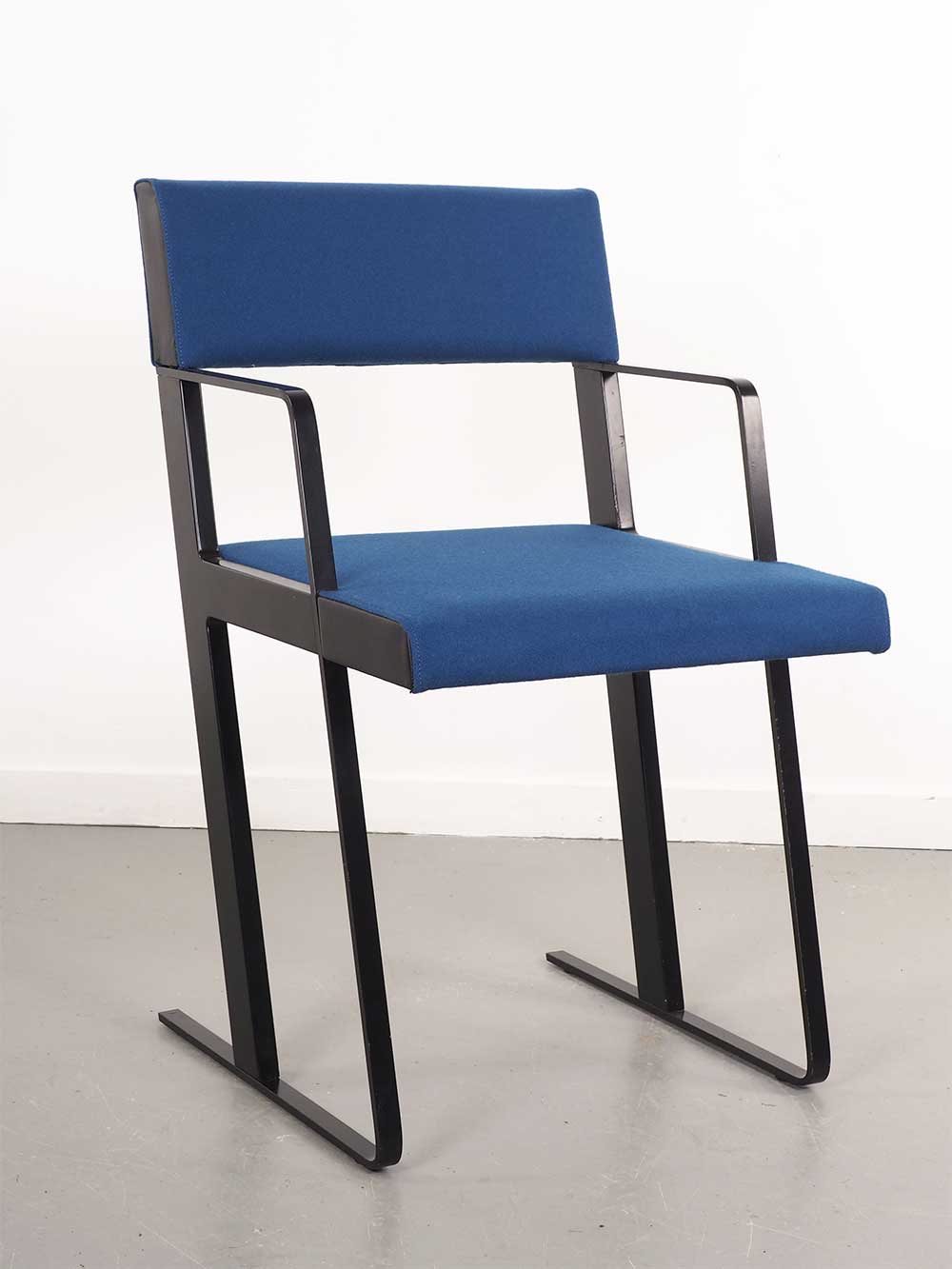 Dutch “DC” chairs by Dick Spierenburg for Castelijn, designed in 1978. The frame is made of metal. The chairs are newly upholstered with a cobalt blue felt furniture fabric. This design by Dick Spierenburg is a fine example of Dutch Post Modern Design.