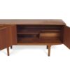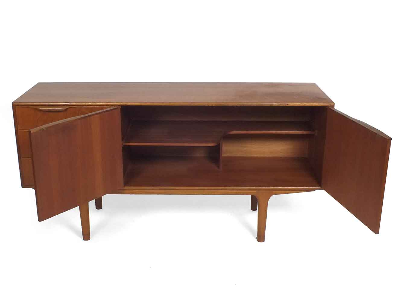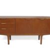 This small teak sideboard is designed by Tom Robertson for McIntosh (Scotland). This is a beautiful 60s cabinet with organically shaped, almost sculpted handles. On the left side of this sideboard are three drawers: two large drawers and one regular size. The top drawer is lined with felt and has compartments for cutlery. On the rightside are two doors with a shelf behind them.