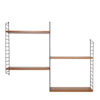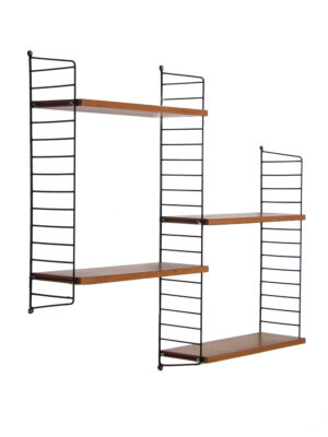 Modular wall system designed by Kajsa and Nisse Strinning in 1948. This set consists of tree black plastic coated wall rails and four shelves. You can place the shelves at any desired height in the system.
