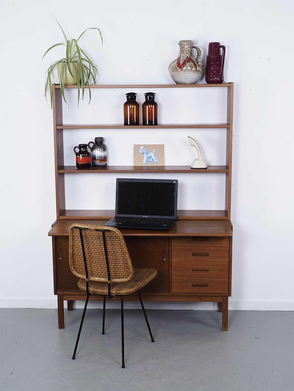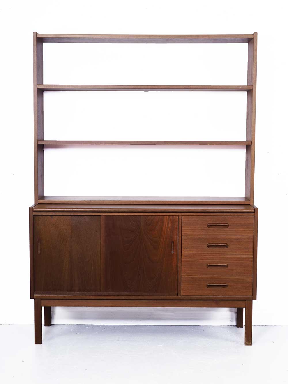 Swedish bookcase with extendable desk. Beautiful Swedish cabinet that has a pull-out shelf to turn this tasteful piece into a workstation. It has 4 drawers and 2 sliding doors.
