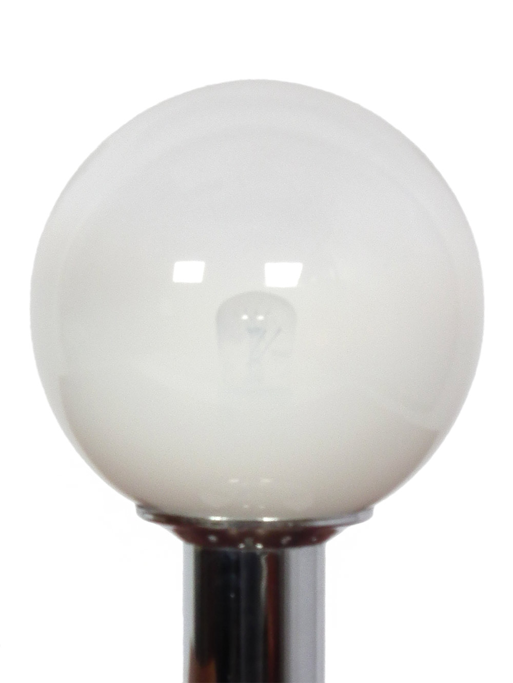 Special table lamp by Targetti Sankey: A chrome base with a glass ball shaped hood. The glass ball runs from clear to white glass.